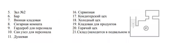 Дизайн интерьеров навеян мотивами французского ампира времен Наполеона III, характеризующийся обилием зеркал, канделябров, использованием в палитре цветов золотых и бордовых оттенков, что делает обстановку ресторана одновременно торжественной и в то же время очень комфортной для гостей. Гостевая зона включает в себя удобный холл с гардеробом и две гостевых туалетных комнаты, объединенных во входную группу; два больших торговых зала, один из которых может быть использован в качестве места для танцевальной программы; бар; винную кладовую, оснащенная необходимым оборудованием для правильного хранения напитков; сигарную комнату. Пространство обыграно очень профессионально и при необходимости может быть преобразовано в камерные залы либо в анфиладу залов. Это достигается благодаря стеклянным дверям, разделяющим помещения и декоративной стеклянной витрине, через которую гости могут наблюдать за работой поваров на кухне. В ресторане используется профессиональная банкетная мебель, которая может быть трансформирована под любое мероприятие по желанию заказчика. Обширные производственные помещения включают: горячий цех, холодный цех, кондитерский цех, помещения для больших холодильных и морозильных камер, мойку, кладовую для посуды, кладовые для продуктов, бельевую, два кабинета, сан. узел для персонала, гардероб и душевую для персонала.