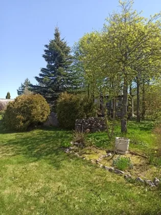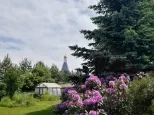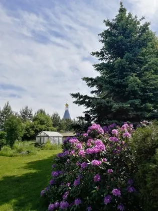 От предыдущих владельцев остаётся настоящее сокровище - сад! Взрослые туи и вечнозелёные рододендроны, нежные нарциссы, разлапистые ёлки и пушистые гортензии, лилейники, ревень. Создать и вырастить подобное зелёное разнообразие стоит немалых усилий. Разбит небольшой огород - грядки с клубникой, парники для томатов, огурцов, перцев, баклажанов. Есть плодовые деревья (яблони, груши).