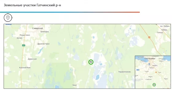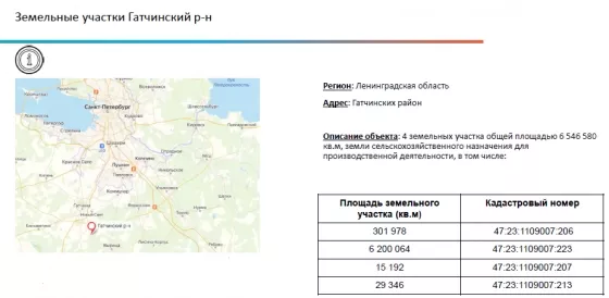 Продаются земельные участки Гатчинский р-н, общая площадь - 6546580 м2. Земли сельскохозяйственного назначения для производственной деятельности. Коммуникации отсутствуют. В состав реализуемого имущества входят 4 земельных участка: